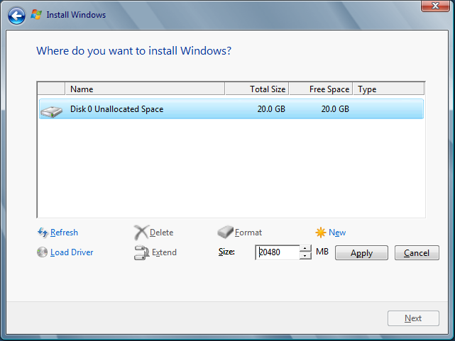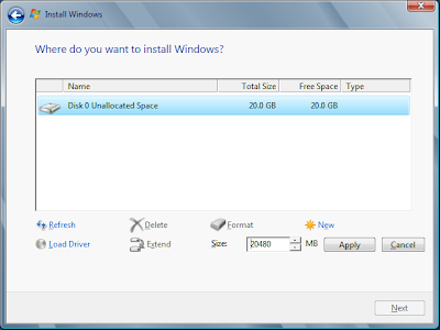15. Lalu kemudian click New untuk membuat partisi, setelah menentukan size, lalu di apply.
