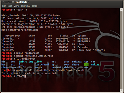 - kemudian install grub untuk memperbaiki grub lama: root@bt:~#grub-install –root-directory=/media/root /dev/sda